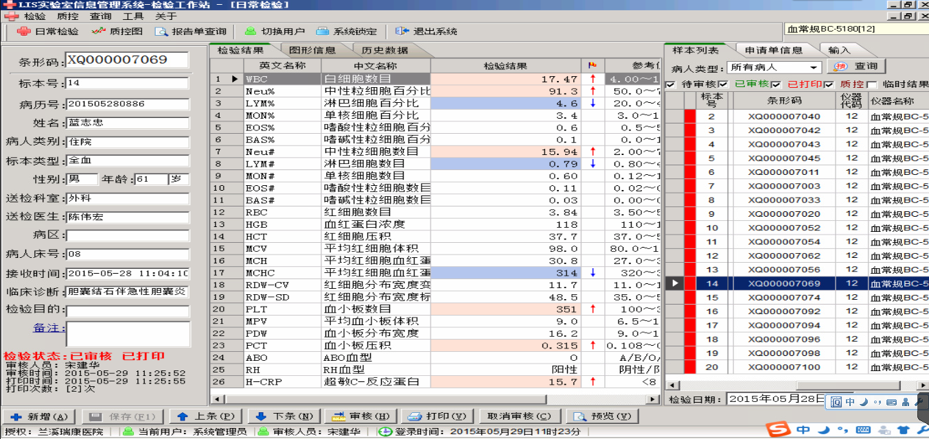 质量控制管理 | 临检质控:对临检中心规定的质控项目及数据的处理; 多质控绘图:支持在一个坐标内可同时观察六个不同水平的QC叠加图; 病人趋势:根据病人趋势找出需要复查的数据; 异常结果:根据医学常识找出需要复查的数据; 数据分析:ROC曲线、正态分布、相关统计、阳性查询等高级查询统计报表,利用分析结果辅助科研。 |